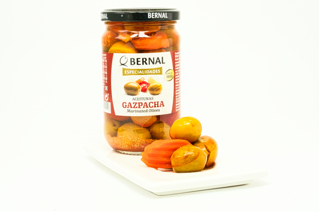 Autentisk spansk smak i hvert glass! Gazpacha-olivene fra Bernal Especialidades er marinerte grønne oliven kombinert med sprø grønnsaker som gulrot og paprika, krydret med middelhavsurter og hvitløk. En tradisjonell oppskrift fra Sør-Spania som gjør dem perfekte som tapas, snacks eller til salater.
